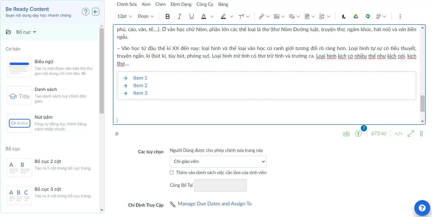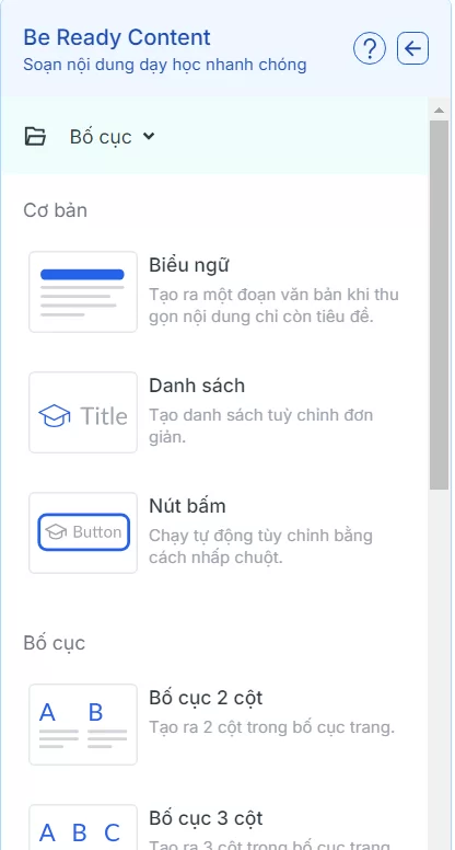 Bước 2: Chọn vào Bố cục để mở ra các nội dung mở rộng. Chọn Nội dung sách giáo khoa.