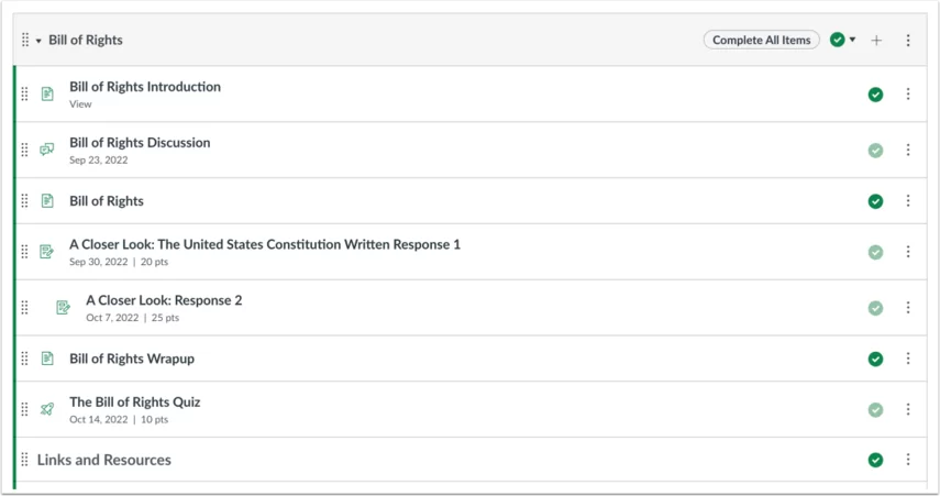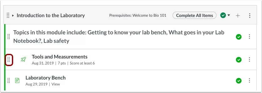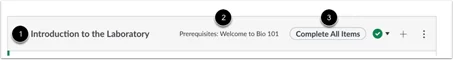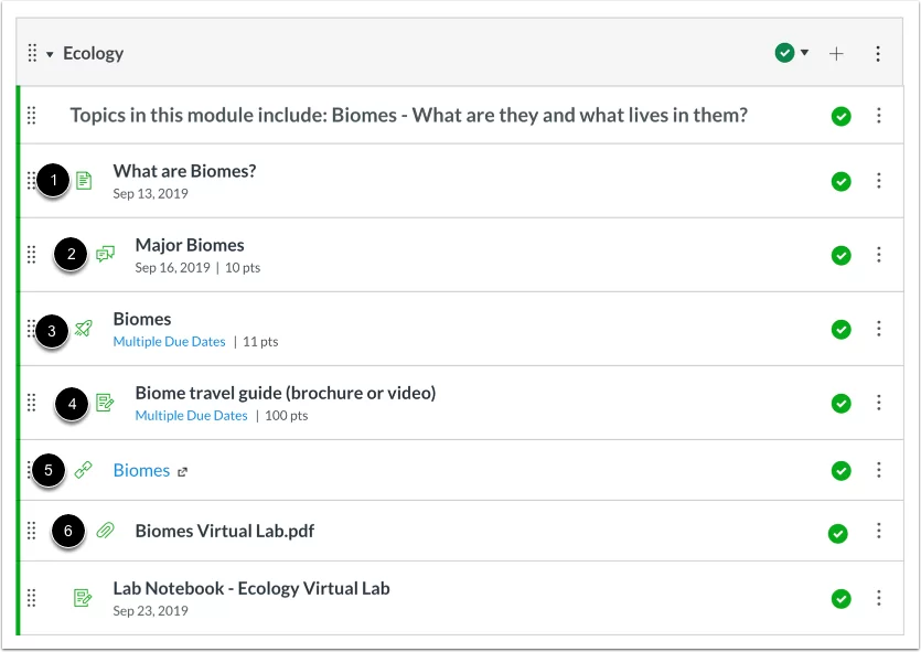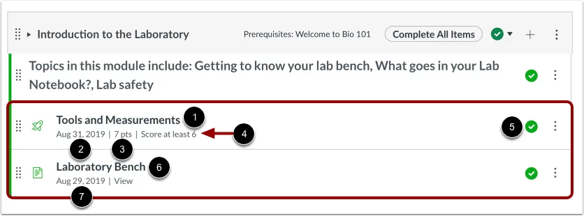 Mỗi module chứa các mục nội dung module có thể hiển thị tên mục (1), ngày đến hạn (2), số điểm (3), yêu cầu module (4) và trạng thái bản nháp của mục module(5). Một module cũng có thể bao gồm các mục không được chấm điểm (6), ví dụ như các trang và các cuộc thảo luận không được chấm điểm. Nếu việc cần làm được thêm vào một mục không được chấm điểm, ngày đó sẽ hiển thị bên cạnh mục module(7).