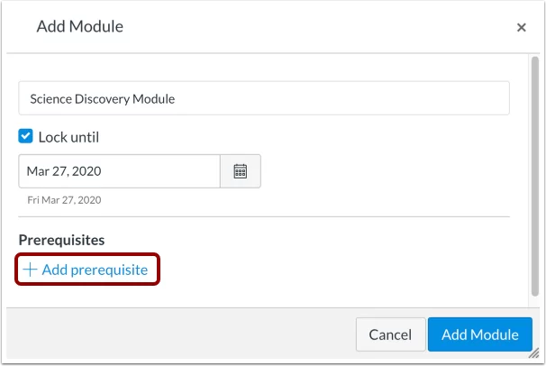 Nếu bạn đã thêm ít nhất một module vào khóa học của mình, bạn có thể yêu cầu một mô-đun tiên quyết . Module tiên quyết có nghĩa là sinh viên phải hoàn thành các module đã thêm trước khi họ có thể xem module mới.