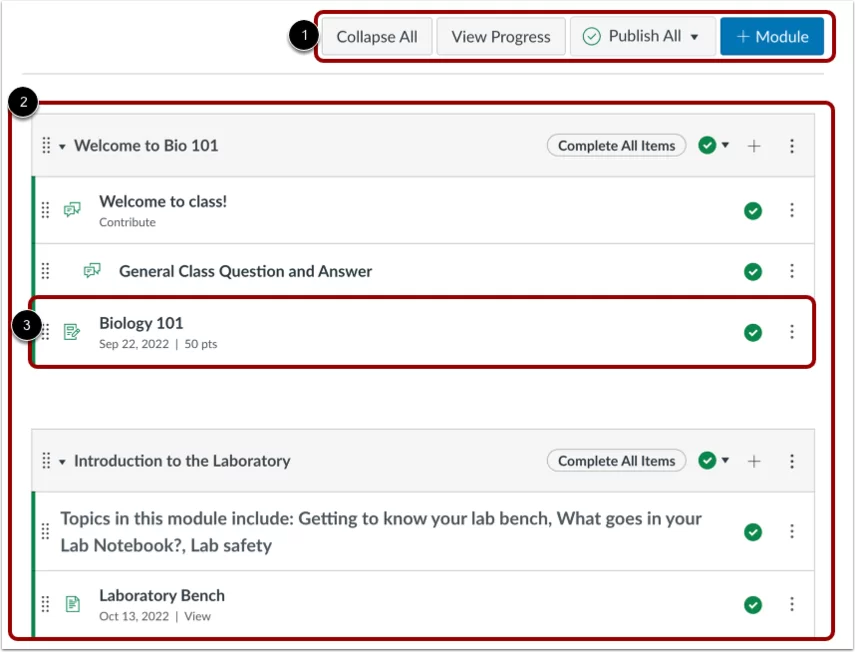Trang chỉ mục module được thiết kế với các thiết lập chung ở đầu trang(1) theo sau đó là các module riêng lẻ (2). Các mục nội dung khóa học được lồng vào nhau trong mỗi module (3).