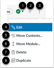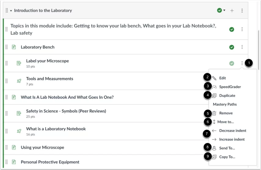 Đối với mỗi mục nội dung module riêng lẻ, bạn có thể sử dụng menu tùy chọn (1), chỉnh sửa mục nội dung (2), mở SpeedGrader (3), sao chép mục nếu mục hỗ trợ sao chép (4), xóa mục nội dung khỏi module (5), di chuyển mục (6), thụt lề mục lên đến 5 cấp (hoặc xóa thụt lề) (7) để gửi nội dung cho người dùng khác (8) hoặc sao chép sang khóa học khác (9).