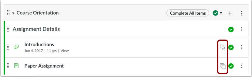 - Bài kiểm tra —Chỉ các bài kiểm tra được tạo bằng Bài kiểm tra mới mới được hỗ trợ để sao chép trong các module. Nếu một mô-đun chứa một bài kiểm tra được tạo bằng công cụ bài kiểm tra Canvas cổ điển, tùy chọn sao chép một module sẽ không hiển thị trong menu module. Có thể sao chép các module bằng cách xóa bài kiểm tra cổ điển khỏi module. Bài kiểm tra cổ điển được biểu thị bằng biểu tượng Bài kiểm tra trống; Bài kiểm tra mới được biểu thị bằng biểu tượng Bài kiểm tra đã tô màu.