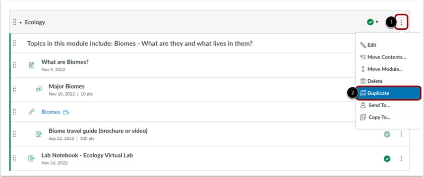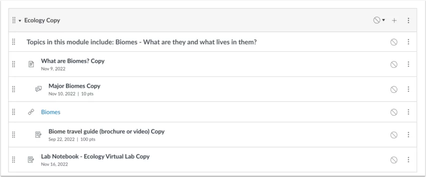 Bạn có thể sao chép các bài tập, thảo luận được chấm điểm và các trang trong một module trong một khóa học. Khi một module được sao chép, từ Sao chép sẽ được thêm vào cuối module.