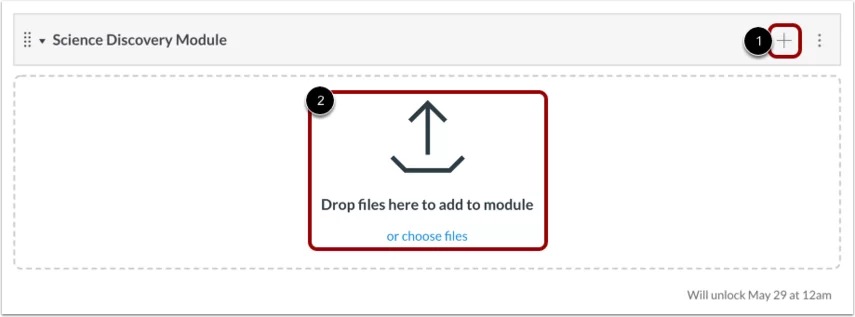 Để thêm các mục vào module của bạn, hãy nhấp vào biểu tượng Thêm [1] hoặc kéo và thả để thêm tệp vào module trống [2].