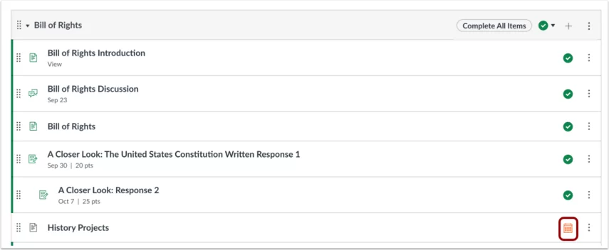 Lưu ý: Nếu áp dụng cho khóa học của bạn, trang Mô-đun sẽ hiển thị bất kỳ biểu tượng Khóa học Blueprint hoặc Đồng bộ hóa với SIS nào sau khi trang được làm mới.