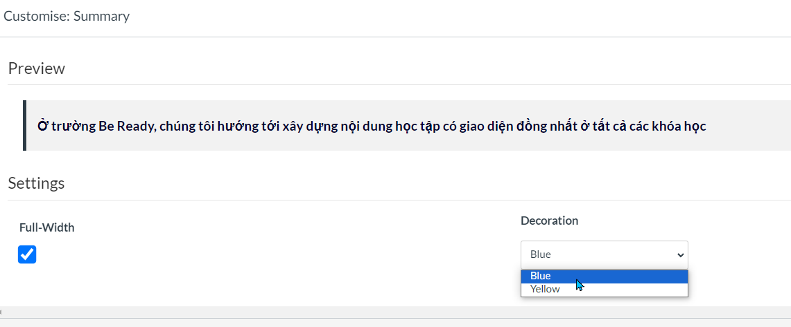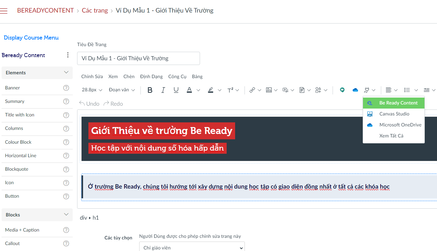 Trước khi giáo viên quyết định sử dụng nội dung nào. Nhà Trường/ IT có thể chèn vào các hướng dẫn, giải thích về nội dung này ví dụ như: